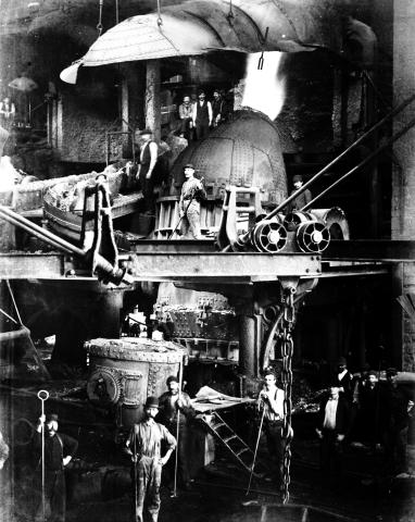 This undated (ca. 1895?) image shows workers and a Bessemer converter for making steel at the Pennsylvania Steel Company's plant in Steelton, Pennsylvania, where the frog and switch division and a rail mill plant were located.