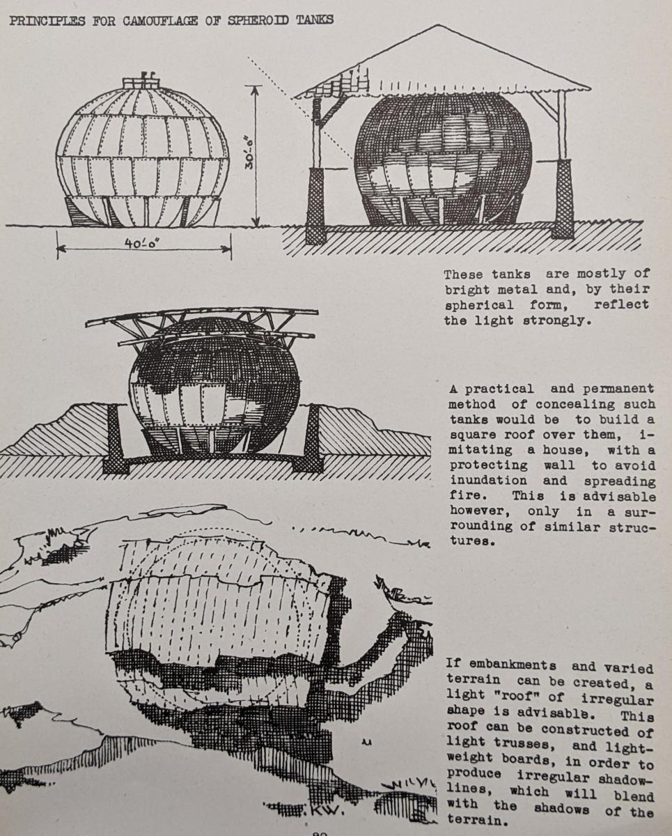 Illustrations and models from The Industrial Camouflage Manual show means of hiding a large industrial storage tank. Hagley Museum and Library.