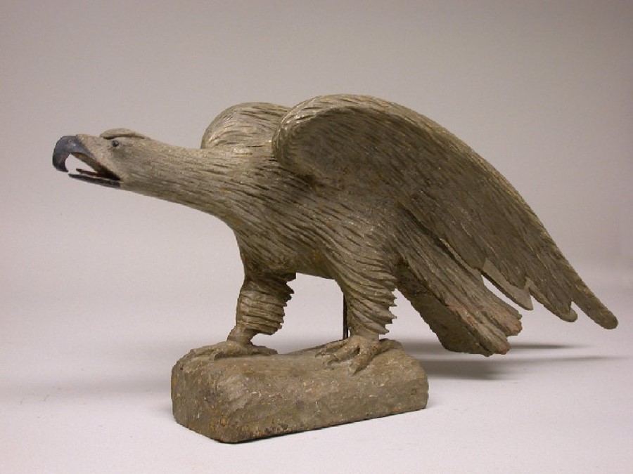 For herself, Mrs. Crowninshield purchased early American furniture; Chinese Export, French, English and American ceramics; pewter; chalk ware; quilts, hooked rugs; weathervanes, and lots of items representing eagles such as the carving shown below.