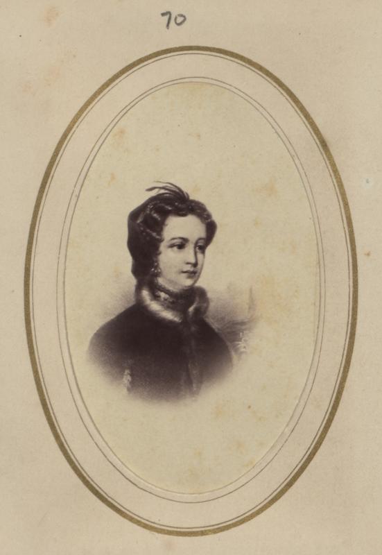 However, it is possible to find some albumen prints in very good condition, with white highlights and deep purple blacks. This type of preservation may be linked to the use of a gold chloride toning solution during the printing process. This albumen photographic reproduction of a drawing of a lady has some staining of white areas but is otherwise in excellent condition.