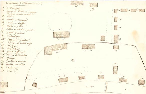 Image: Layout of the Eleutherian Mills by Gabriel Denizot. Many of the buildings shown here were destroyed in the 1818 explosion.