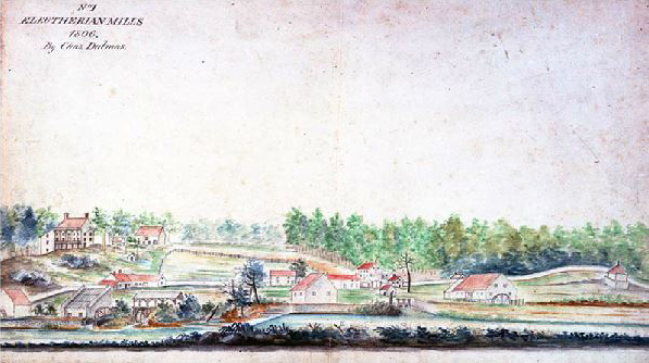 Image: Charles Dalmas' sketch of Eleutherian Mills, 1806. This is the first known drawing of DuPont's gunpowder factory