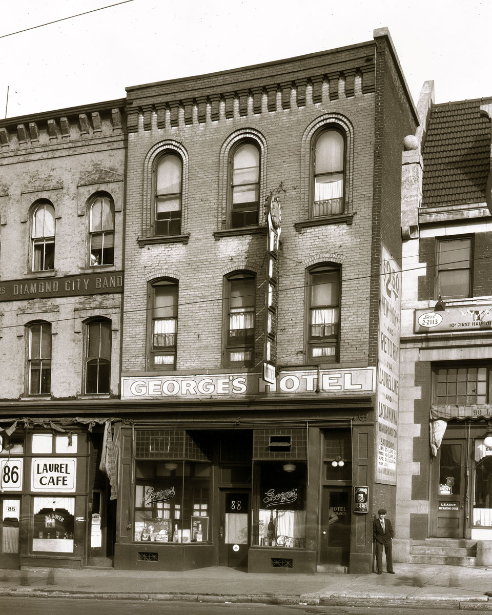 A close look at the storefront of George's Hotel reveals a window display full of merchandise from the nearby Steigmeier Brewing Company, also of Wilkes-Barre.