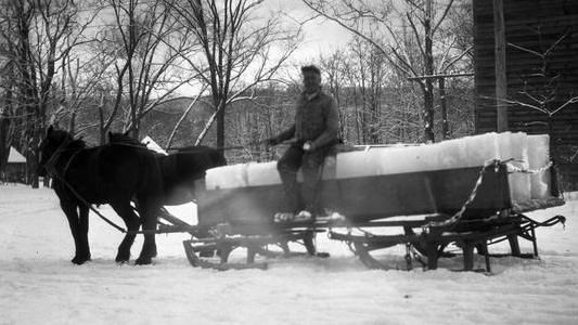 Fitzharris: Well, we had refrigerators...We lived across the crick and there were just doors in front, so they brought it right...The kitchen and the main family room was right next door, you know. Like a long porch. And they would bring it right there. He'd put it in the refrigerator. Mostly they were like top icers. You put the ice in top, and the refrigeration was in the bottom. Two doors.