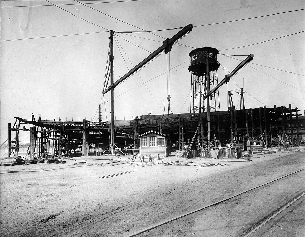 This is the first image of the Lydonia II in the Pusey and Jones Corporation Photograph Collection. The keel lays on wooden blocks surrounded by scaffolding on shipway no. 1, the westernmost in Pusey and Jones's Wilmington shipyard. The yacht's bow will eventually point inland, away from the camera, so that it can be launched stern first into the Christina River.