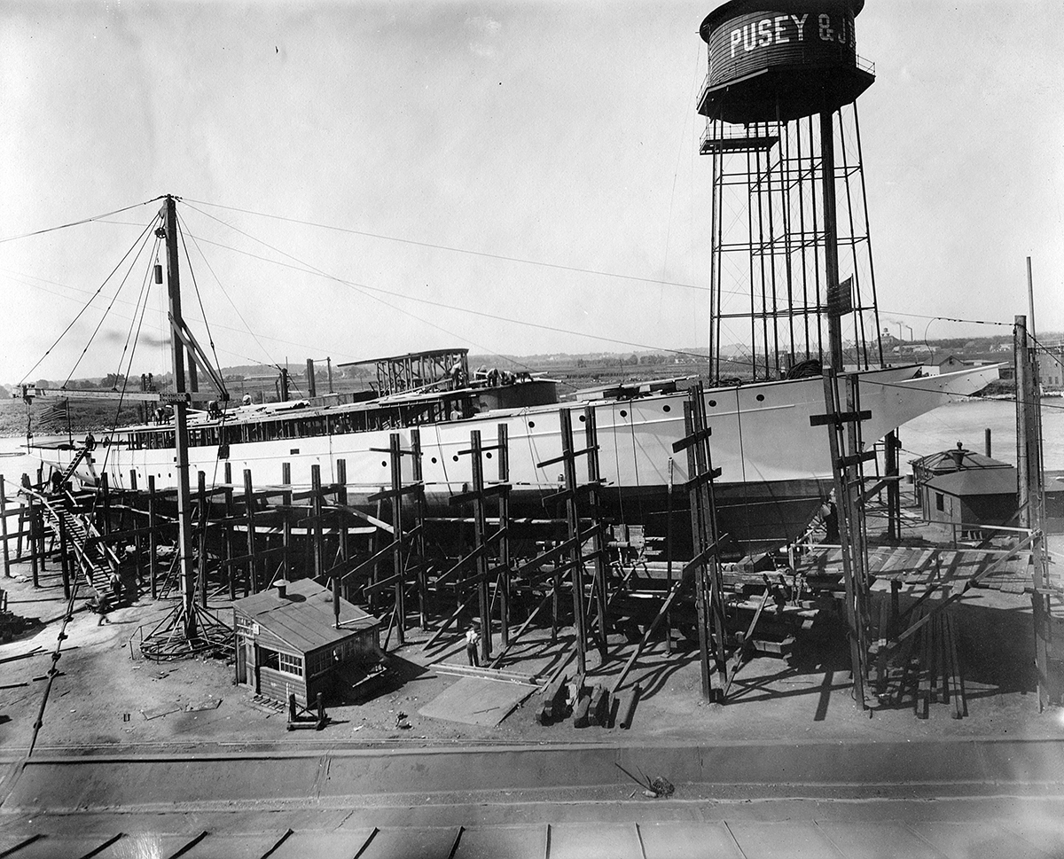 This final image of the Lydonia II on the shipway looks southwest over the Christina River toward South Wilmington. Construction of the yacht's superstructure is well underway. The painted hull and American flags flying from the bow and stern indicate that launch day is near.